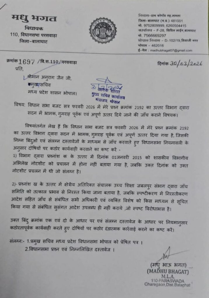 विधायक ने मुख्य सचिव को पत्र लिखकर कहा कि विधानसभा के बजट सत्र 2026 में पूछे गए उनके प्रश्न (क्रमांक 2192) के जवाब में विभाग ने यह कहकर पल्ला झाड़ लिया कि ऐसी कोई शिकायत या फाइल लंबित नहीं है, जबकि विभाग में संबंधित अनियमितताओं की जानकारी पहले से मौजूद थी।